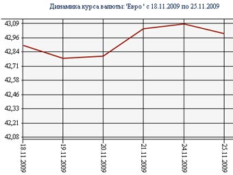 Банк России установил официальный курс евро на 25 ноября на уровне 42,9981 рубля, понизив его более чем на восемь копеек. На выходных и в начале текущей недели европейская валюта стоила более 43 рублей.