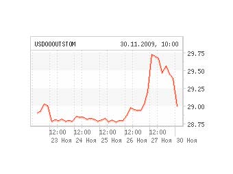 Курс доллара на ММВБ с расчетами "завтра", рассчитанный по последней сделке, в первые секунды торгов 30 ноября упал более чем на 40 копеек и опустился ниже отметки в 29 рублей. Это означает, что средневзвешенный курс, который по итогам пятничных торгов составлял 29,65 рубля, опустится еще значительнее.