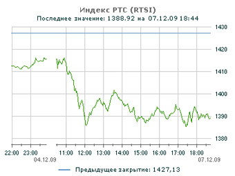 Российские фондовые индексы начали неделю со значительного падения: ММВБ по итогам сессии 7 декабря сократился более чем на полтора процента до 1322 пунктов, а РТС - на 2,63 процента до 1389 пунктов. Ниже 1400 пунктов РТС не закрывался в декабре еще ни разу.