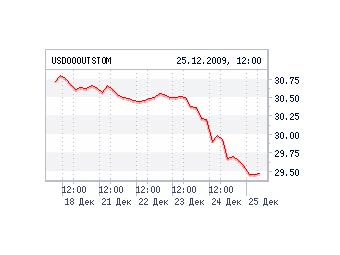 Средневзвешенный курс доллара в ходе торгов 25 декабря на ММВБ снизился на 35 копеек по сравнению с предыдущим днем, упав к 11:00 по московскому времени до отметки 29,42 рубля. Евро подешевел еще сильнее - на 42 копейки до 42,4 рубля. Бивалютная корзина, рассчитанная по последней сделке, опустилась на 11 копеек до 35,33 рубля.