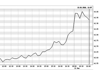 Курсы евро и доллара в первый час торгов на ММВБ 13 января продолжили укрепление по отношению к рублю. Так, стоимость европейской валюты поднялась к 10:40 по московскому времени на 17 копеек до 43 рублей, после чего начала постепенно снижаться и к 11:00 составляла уже 42,93 рубля. Курс доллара, в свою очередь, вырос на семь копеек до 29,65 рубля.
