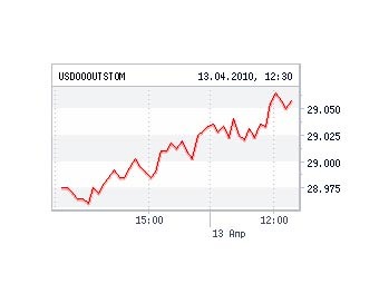 Доллар на ММВБ опустился ниже отметки в 29 рублей в ходе торгов 12 апреля. В тот же день Банк России установил курс доллара уровне 28,9428 рубля.