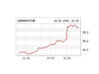 В первые часы торгов утром 28 апреля средневзвешенный курс доллара на ММВБ поднялся сразу на 28 копеек до 29,38 рубля. Американская валюта дорожает уже второй день подряд на фоне новых опасений относительно выплаты долгов Грецией, входящей в еврозону.