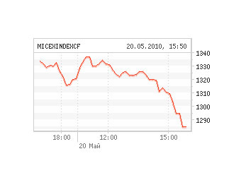 Российские фондовые индексы резко снизились в первой половине торгов 20 мая: РТС просел на 3,54 процента до 1330,97 пункта, а ММВБ - на 2,57 процента до 1287,01 пункта. Так низко оба индекса не опускались с ноября 2009 года.