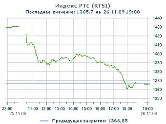 Российские фондовые индексы 26 ноября значительно снизились на фоне подешевевшей нефти, падения курса рубля и неблагоприятной внешней конъюнктуры. За день РТС потерял 4,25 процента, зафиксировавшись в районе 1367 пунктов, а ММВБ опустился на 3,29 процента до 1268,92 пункта.