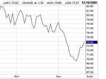 Цены на нефть в предыдущие недели стабильно снижались (и даже опустились ниже отметки в 70 долларов за баррель) на фоне беспокойства инвесторов о возможном падении спроса из-за новой волны глобального экономического кризиса. Ожидания обострения кризиса были связаны с ситуацией вокруг долгов эмирата Дубай и Греции.