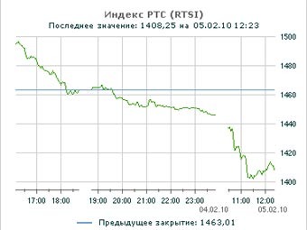 Российские фондовые индексы в начале торговой сессии 5 февраля продолжили начатое днем ранее падение. За первые часы торгов основной показатель РТС сократился на 4,04 процента до 1403,86 пункта, а ММВБ - на 2,7 процента до 1358,13 пункта.