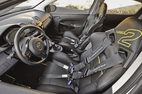 В салоне турбированной Mazda2 появились спортивные [ковшиk и гоночная электронная панель приборов.